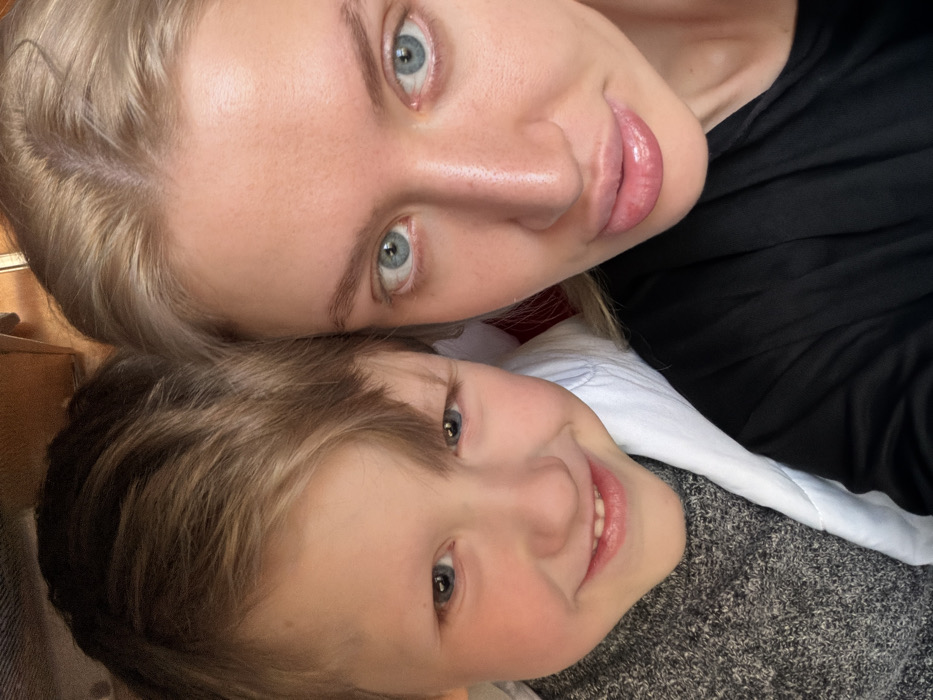 The image captures a close-up portrait of an adult female and a young male child, located in Goričani, Montenegro. The female, positioned on the right, has fair skin, blonde hair, and blue eyes, with full lips and a neutral to slightly smiling expression. She is wearing a black top. The male child, positioned on the left, has fair skin, light brown hair, and blue eyes. He displays a broad smile, showing his teeth, and is wearing a grey textured top with a white collar visible beneath. Both individuals are looking directly into the camera. The background is blurred and indistinct, suggesting an indoor setting with hints of light brown and reddish-brown surfaces.