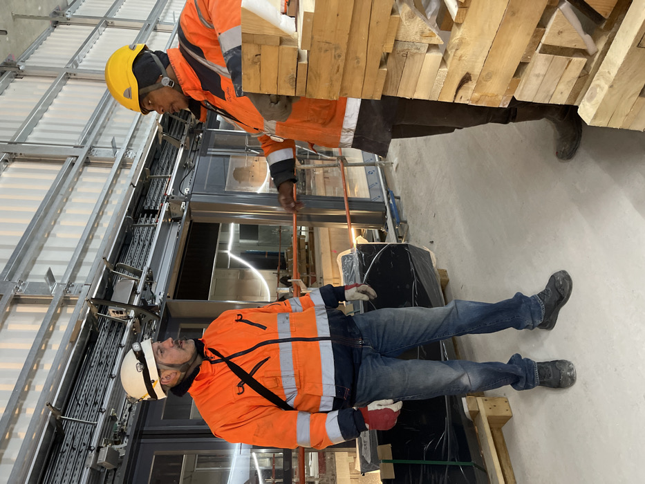 The image depicts an indoor construction site in Antony, France, featuring two male construction workers engaged in conversation