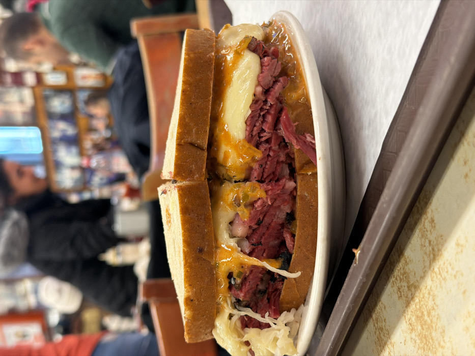 A close-up, slightly angled shot features a heavily loaded deli sandwich on a small white plate. The sandwich, composed of thick-cut bread, is filled with pastrami, melted cheese, and sauerkraut. A brown tray supports the plate. In the background, people are blurred, adding depth of field to the image. The lighting highlights the texture of the sandwich.