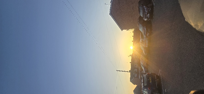 This image depicts a residential street parking area in Reading, United Kingdom, during either sunrise or sunset. The sun, a bright yellow-orange sphere, is positioned low on the horizon in the lower-middle background, emitting prominent lens flares and distinct light rays horizontally across the scene. The sky above is clear and a solid deep blue, gradually lightening towards the horizon. The foreground consists of a dark asphalt parking surface, exhibiting faint white line markings for parking bays. Multiple vehicles are parked. On the left, the rear of a dark-colored SUV, possibly a BMW model, is visible with the UK registration plate "LG20 JXJ." Towards the center and right, a line of other vehicles, predominantly dark SUVs and hatchbacks, are parked, their specific details partially obscured by the intense sunlight. On the far right, another dark SUV, possibly a Nissan Qashqai, displays the UK registration plate "ML67 XWM." The background features typical British residential buildings. On the left, multiple two-story brick houses with dark tiled roofs extend along the street. A utility pole with several overhead electrical or communication wires stands prominently on the left, with wires extending horizontally across the sky, appearing as dashed lines. On the right, the substantial brick side wall and a portion of the dark tiled roof of a multi-story residential building are visible. No individuals are present, and no actions or interactions are observed within the frame.