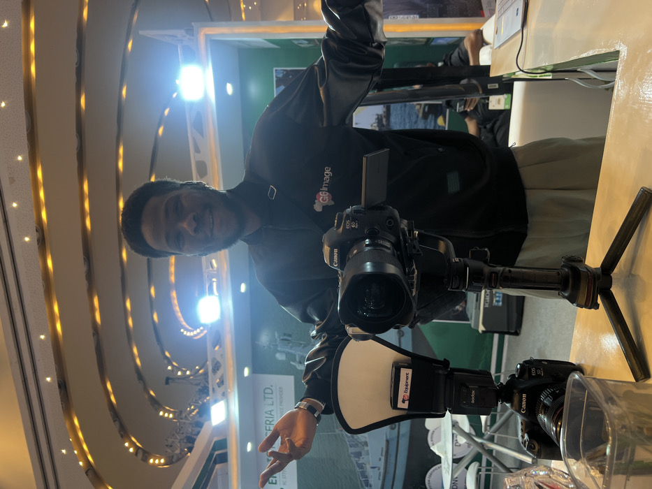The image depicts an indoor scene at an exhibition or conference venue in Lagos, Nigeria. A male subject, appearing to be in his 20s or 30s, with short dark hair and a beard, stands centrally, smiling at the camera. He wears a black zip-up jacket featuring a "G6 Image" logo with an African continent outline on the left chest, and light-colored trousers. His arms are outstretched, palms facing upwards, in a welcoming or explanatory gesture. In the mid-ground, a Canon EOS 6D Mark II DSLR camera with a wide-angle lens is mounted on a small black tripod, with its vari-angle LCD screen extended. To its left, another Canon EOS 5D series DSLR camera rests on a white tabletop. This second camera is equipped with a Godox speedlight flash unit and a white rectangular diffuser, which has a "G6 Equipment" sticker. A clear plastic container is partially visible on the table's left edge. The background reveals a corporate exhibition booth with green and white panels. Visible text includes "ENGEN ERIA LTD." and "RC 379...". Images of boats or ships are displayed on the booth walls, suggesting a marine or offshore industry focus. Overhead, the ceiling features multiple curved rows of recessed yellow lights and several bright, rectangular light fixtures illuminating the booth. To the right of the main subject, a second individual is partially visible, seated on a white sofa, appearing to look down at a mobile phone. A black Igloo cooler and a partially visible laptop are also present on the table to the right.