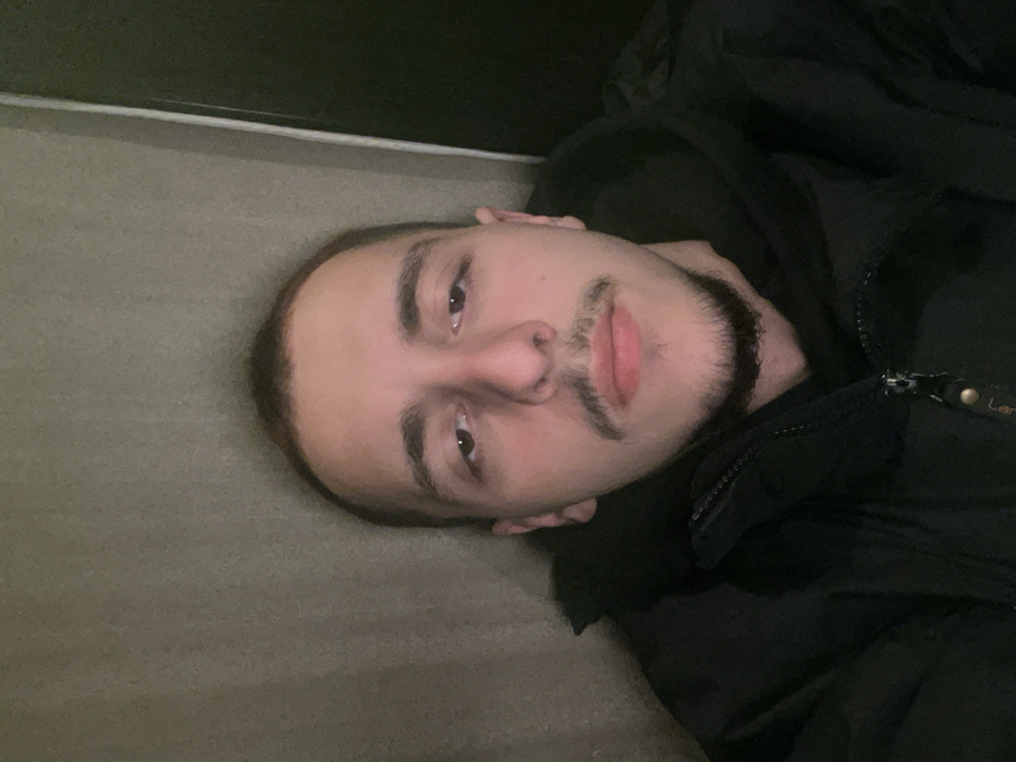 This image, taken in Montana, Bulgaria, features a close-up, head-and-shoulders selfie of a single individual. The subject is a young adult male with light-to-medium skin, short dark hair, dark eyes, a mustache, and a goatee. He maintains a neutral expression, looking directly into the camera. He is dressed in a black puffer jacket over a black hooded garment; the jacket's zipper features a distinctive toggle and a small light-colored tag. The background consists of a plain, light grey wall to the left of the subject and a dark vertical surface, consistent with a doorframe or dark wall section, to the right. The scene is illuminated by interior, diffused lighting.