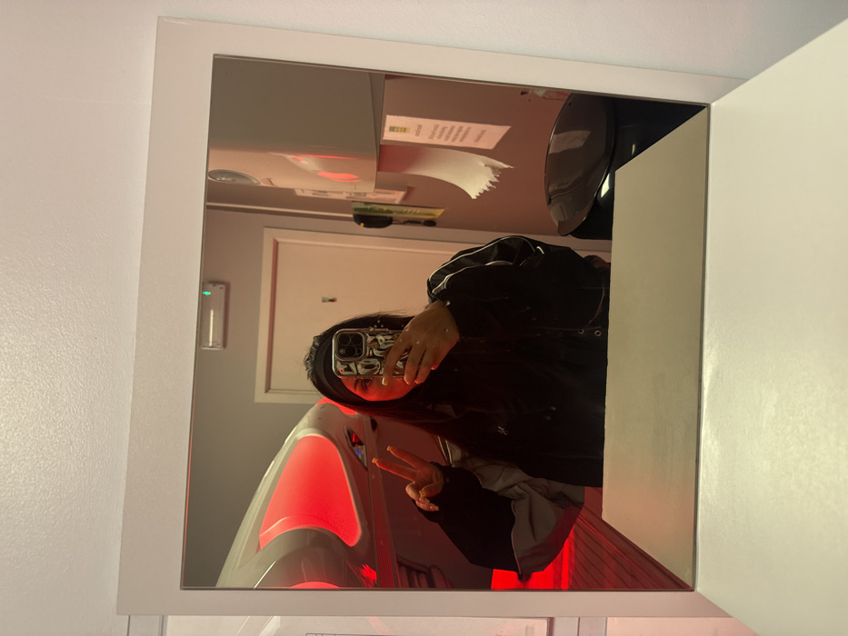 A mirror selfie captures an individual positioned in front of a white-framed mirror, which rests on a white countertop. The subject, likely female, wears a dark headband and a dark jacket. Their face is largely obscured by a smartphone with a reflective, patterned case, held up to take the photograph. The individual's left hand is raised, forming a peace sign (V-sign); the fingernails are painted yellow-orange. Reflected in the mirror is an interior room, identified as a tanning salon booth in Temse, Belgium. Key features include a large, white-and-silver modern tanning capsule visible on the left, emitting a strong red light. In the background, a light-colored door is visible, above which a rectangular occupancy indicator displays a green light. To the right, wall-mounted fixtures include a white dispenser and a white paper towel unit with a torn sheet hanging, positioned above a dark, lidded waste bin. The room's walls are light-colored, predominantly illuminated by the red glow emanating from the tanning unit.