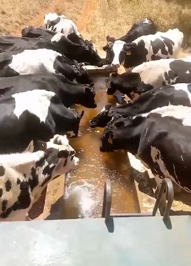 group of black and white cows crowded around a trough of water, all drinking at the same time. There are approximately 15 cows visible, with some facing the camera and others with their backs turned. The trough appears to be made of concrete and is filled with slightly murky water. Bubbles are visible in the water, perhaps from the cows drinking. The ground around the trough is dry and dusty, and there are some trees and other vegetation in the background. A dirt path can be seen leading away from the trough. The camera is positioned above the trough, providing a clear view of the cows and the water. There is a metal ladder-like structure near the camera.