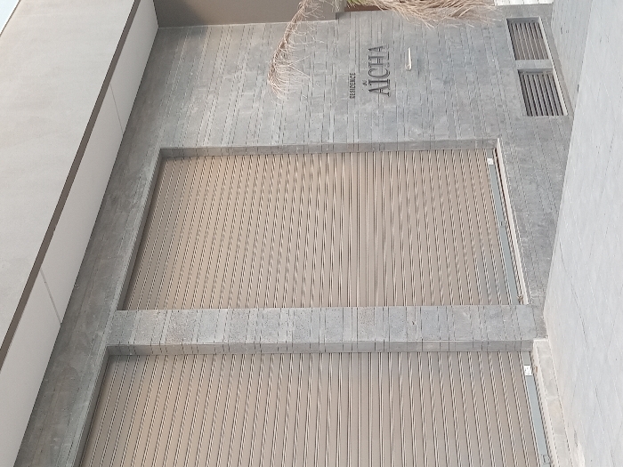 The image displays the exterior facade of a modern building identified as "RESIDENCE AÏCHA" in Meknes, Morocco. The facade is clad in grey, horizontally coursed stone-like tiles or textured concrete. Two large, light-beige, horizontally slatted metal roller shutters are fully closed, covering two distinct ground-level openings. A vertical architectural element, matching the grey facade material, separates the two shutters. Above the facade, a grey soffit or overhang is visible. The words "RESIDENCE" and "AÏCHA" are presented in grey, embossed or affixed lettering on the right portion of the facade. Below the "AÏCHA" text, a small, horizontal metallic fixture is present. Near the base of the facade, to the right, two rectangular grey ventilation grilles are visible. The immediate foreground consists of a light grey paved surface, appearing to be a sidewalk or entrance, which slopes gently downward to the right. Minimal dried, light-colored foliage is partially visible on the far right edge of the frame. The scene is devoid of human presence, actions, or specific interactions. Natural daylight illuminates the scene.