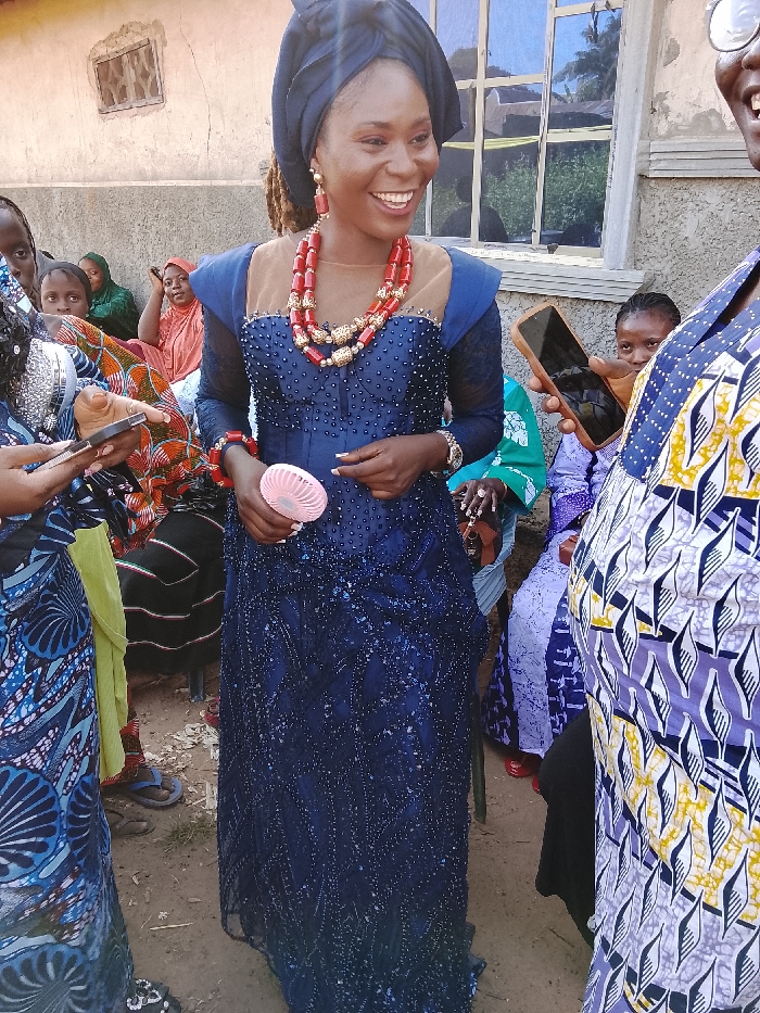 An outdoor scene in Doma, Nigeria, depicts a gathering of people, primarily women, in what appears to be a celebratory context. The central figure is a dark-skinned woman with a broad smile, wearing an elaborate dark blue, sequined, or beaded full-length gown with long sleeves and a sheer decolletage panel. She is adorned with a multi-strand red coral bead necklace, matching earrings, a red coral bracelet on her left wrist, and a silver-toned wristwatch on her right. Her hair is styled in dreadlocks, partially visible beneath a dark blue headwrap. In her right hand, she holds a small, light pink, portable fan. To her immediate left, a person is partially visible, wearing a blue and orange patterned garment and holding a black smartphone horizontally. To her right, another person is partially visible, wearing a purple, white, and yellow patterned garment and holding a brown smartphone vertically. In the background, several individuals, mostly women and children, are seated or standing, observing the scene. They are dressed in various colorful patterned traditional Nigerian fabrics and headwraps. One woman to the far left wears an orange headwrap and garment, while another wears a green headwrap. The setting includes a light-colored building with a large rectangular window and a darker frame immediately behind the central figure. Reflections of greenery and another structure are visible in the windowpane. To the far left, a section of an older, weathered wall with a smaller, barred window is present. The ground is exposed bare earth. The overall atmosphere suggests a social event or celebration.