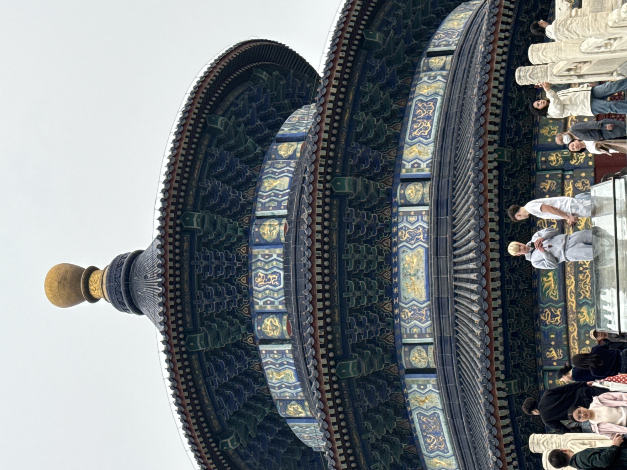 An outdoor, low-angle photograph captures the upper portion of the Hall of Prayer for Good Harvests, located in the Temple of Heaven complex within Dongcheng District, Beijing, China. The prominent architectural structure features a dark blue tiled, triple-eaved circular roof culminating in a golden finial. The eaves and walls display intricate decorative patterns in shades of blue, green, and gold, including stylized dragon motifs. The sky is uniformly overcast. In the foreground, a group of approximately ten individuals is present on a viewing platform and behind a white stone balustrade. A male with blonde hair, wearing a light gray tracksuit, stands centrally, engaged with a mobile phone. Another male in a white t-shirt stands beside him. To the right, a female in a white jacket and blue jeans holds a smartphone, pointed towards the right. Other individuals are partially visible, some walking, others standing, and one person in the mid-ground wears a white face mask. A transparent barrier or railing is visible in the immediate foreground.