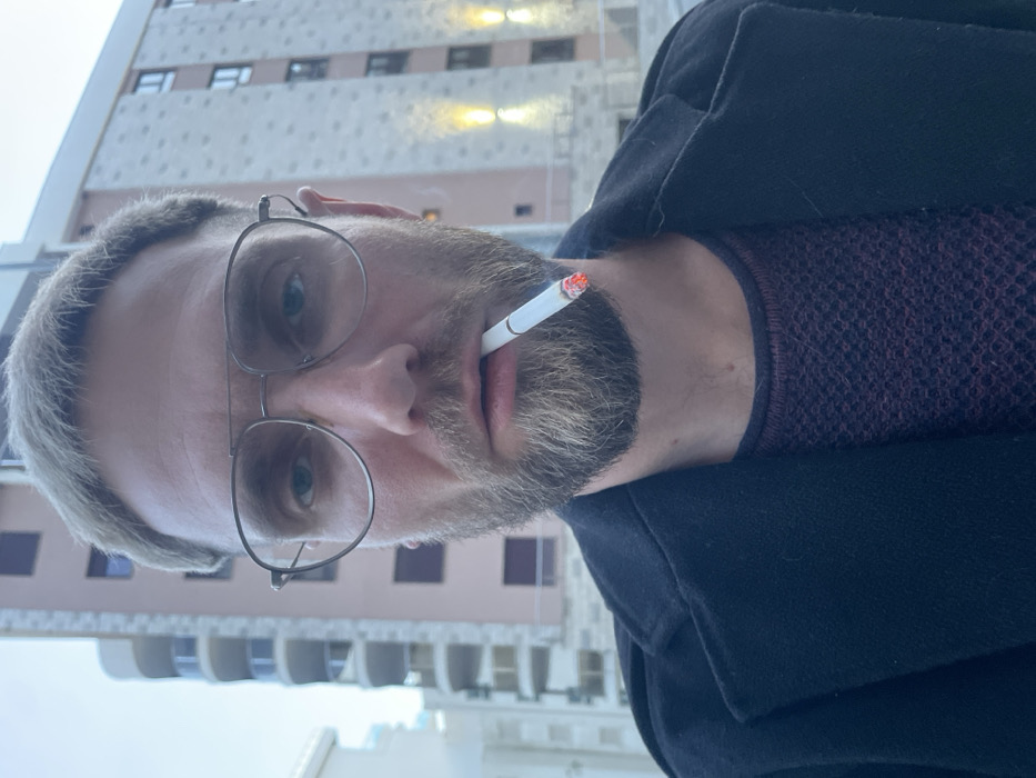 A man with light hair and a beard, wearing glasses, holds a lit cigarette in his mouth. He's wearing a textured, dark-colored shirt underneath a dark coat. In the background, a tall building with many windows is visible. The photo is taken from a low angle, looking up at the man and the building.