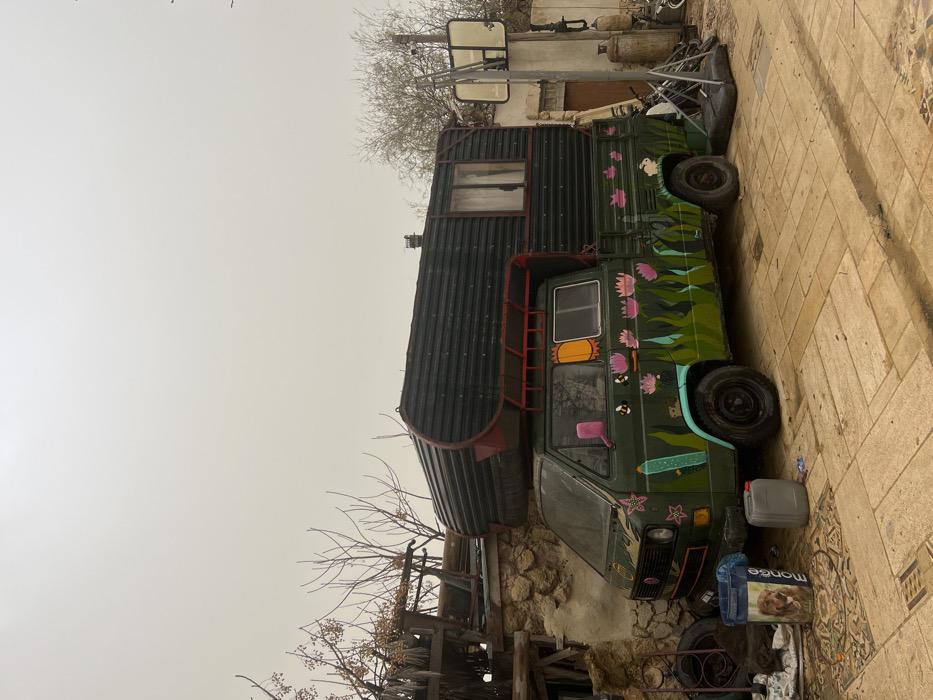 This image depicts a cluttered outdoor scene in Jisr az-Zarqa, Israel, under an overcast sky. The central subject is an olive green Volkswagen Transporter (T3 generation) pickup truck, extensively custom-modified into a camper vehicle. A large, dark-colored, corrugated metal camper unit with a curved front is mounted on the truck's bed, featuring a small window on its side and a chimney pipe on top. A red metal frame connects the camper unit to the truck's cab. The truck's body is decorated with colorful, folk-art style paintings including pink lotus flowers, green foliage, blue geometric shapes, yellow suns, and white rabbit motifs. Its side mirrors are pink. To the immediate left of the truck's front wheel, a blue plastic trash bin featuring a dog's image and the word "monge" is visible. Two grey plastic jerry cans are on the ground beside it. Against a rough, stone wall to the left of the vehicle, stacked tires and other debris are present. Above the wall, tangled bare tree branches with some dried yellow fruits extend into the frame, along with wooden structures. To the right of the vehicle, a freestanding basketball hoop with a white backboard and orange rim is positioned, with its dark base resting on the ground. Behind the hoop, various items including a tall grey gas cylinder, smaller gas cylinders, and metal scraps are visible. Further in the background, a light-colored, possibly dilapidated structure is seen, with sparse, leafless vegetation in the distance. The ground is paved with light brown, irregularly shaped tiles, showing signs of dampness or stains. No individuals are present.