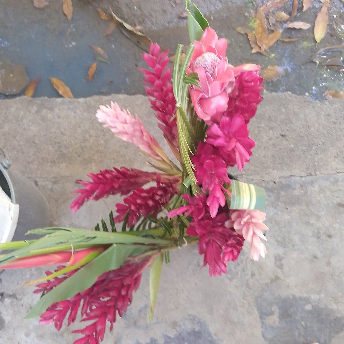 A bouquet of tropical flowers is displayed vertically on a gray concrete surface in Juan Griego, Venezuela
