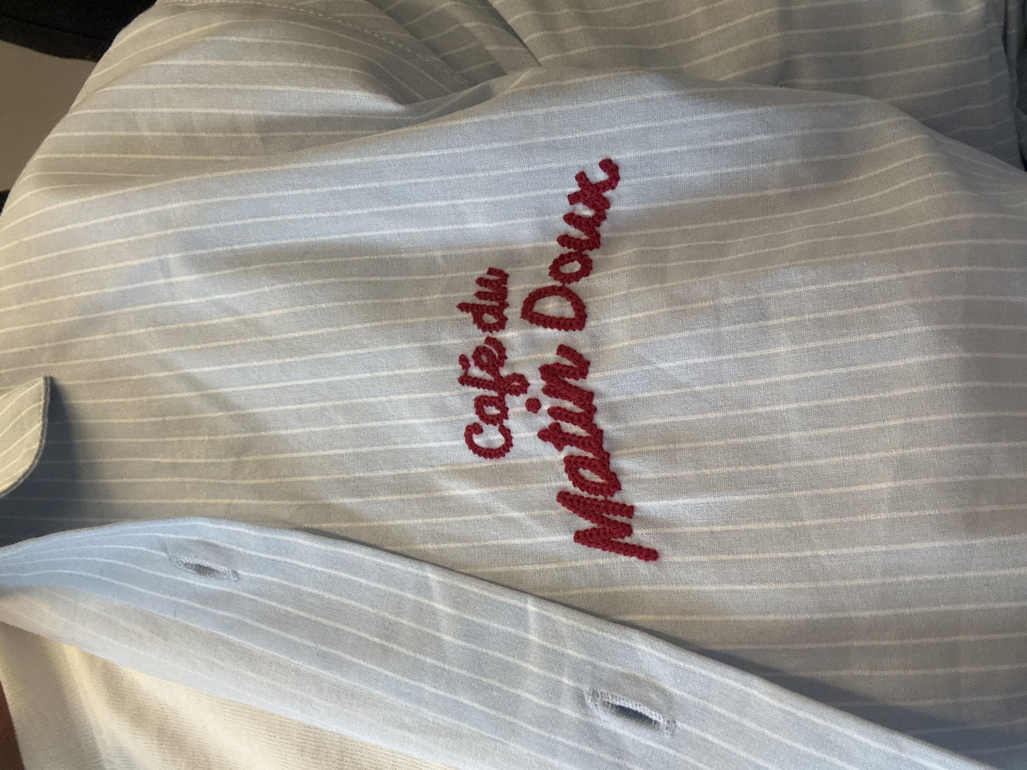 A close-up shot reveals a light blue and white striped shirt with the embroidered words "Cafe du Matin Doux" in red thread