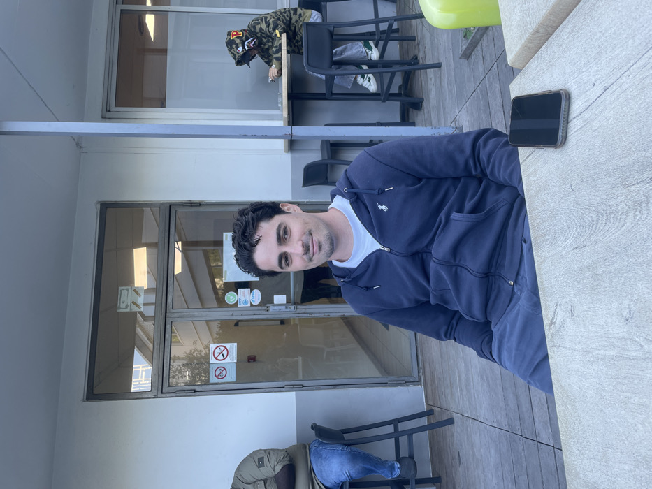 The image displays an outdoor seating area adjacent to a building, identified as a professional training center or higher education institution in Montpellier, France, based on visible certifications. The exact address is not discernible from the provided context. In the foreground, a male individual with dark, wavy hair is seated at a light wood-grain table, looking directly at the camera with a slight smile. He wears a navy blue zip-up hoodie over a white t-shirt and navy blue trousers. A black smartphone with a dark screen is positioned face-up on the table to his right. In the background, to the left, a second individual is partially visible from the chest down, seated on a black bar stool, wearing an olive green shirt and blue jeans. To the right, a third individual is seated at another light wood-grain high table, also on a black bar stool. This person wears a camouflage-patterned hoodie with the hood up, displaying a "P" emblem on the left side of the hood. They are holding what appears to be a lit cigarette in their right hand, looking down at the table where an ashtray is present. The building's exterior wall is light-colored. A set of glass double doors, likely an entrance, is situated behind the central subject, bearing two circular "No Smoking" signs and several other circular certification stickers, including "Qualiopi", "FP2S", and "SYFO". A red fire alarm pull station is visible through the glass on the left door. A grey structural pillar stands to the right of the entrance. The ground is covered with wooden decking. A partial view of a lime green object is visible on the right side of the foreground table.