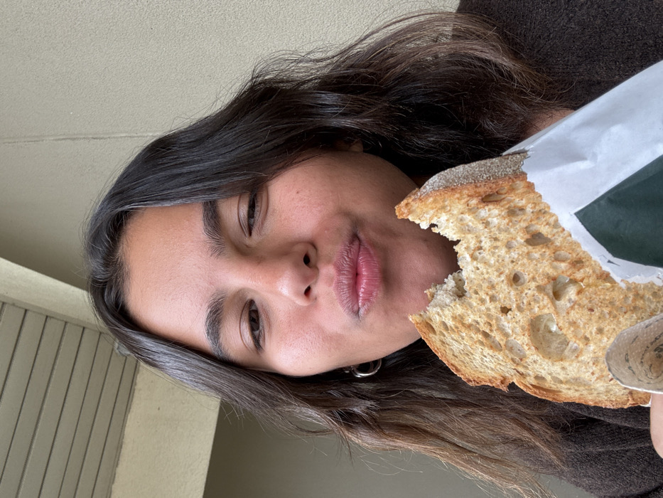 - "A young adult female is depicted in a medium close-up, holding a thick slice of toasted bread, partially consumed, wrapped in white paper with a green section" by FM-4vhV22, licensed under CC BY 4.0