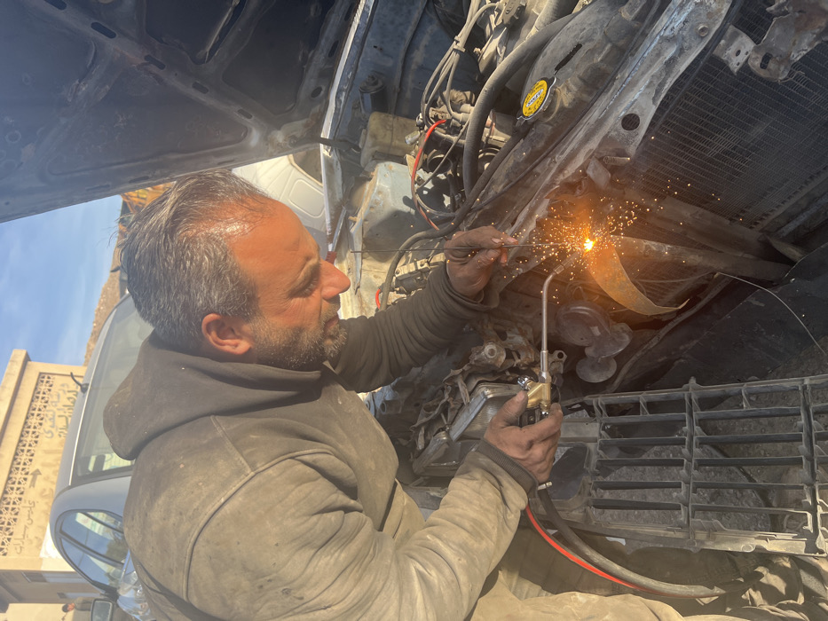 An adult male, with a beard and dark hair, wearing a dark, soiled hooded sweatshirt, performs welding on a vehicle in At-Tall, Syria