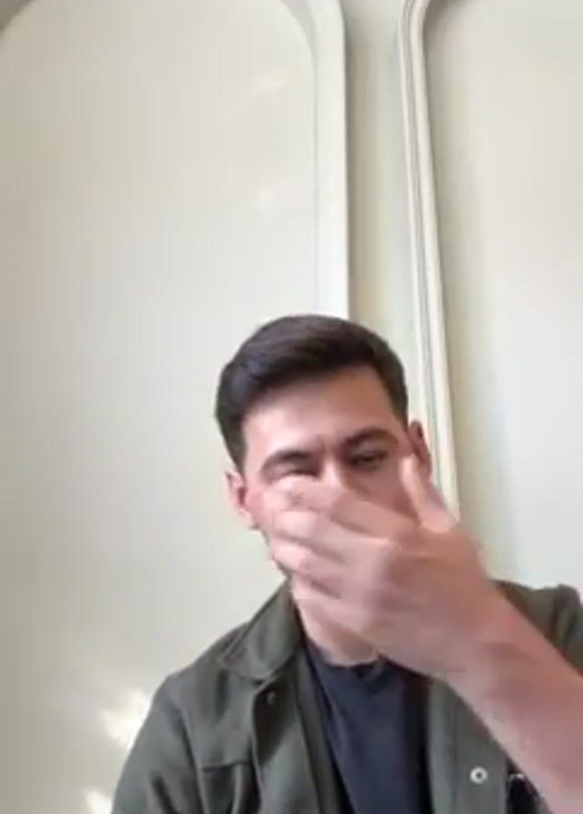 A man faces the camera directly. He wears a green collared jacket over a dark-colored shirt. He touches his chin briefly and then runs his hand through his hair. The background consists of a plain wall with two framed, arched designs.