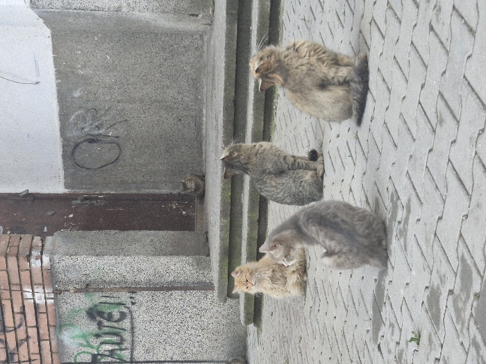 - "This image captures an outdoor urban scene in Sofia, Bulgaria, featuring five domestic cats in front of a weathered building entrance" by FM-ZKxzo2, licensed under CC BY 4.0