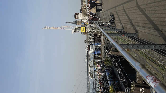 This image depicts a daytime scene on the Rhine promenade in Dusseldorf, Germany. In the foreground, a silver metal railing runs diagonally from bottom-left to mid-right, displaying faint sticker remnants. Adjacent to the railing on the left, a concrete mooring post is visible, marked with the white numeral "05". To the right of the railing, a paved pedestrian walkway stretches into the distance, exhibiting long, parallel shadows cast by the railing and other objects. Two bicycles and one electric scooter are parked, leaning against the railing on the walkway. In the midground, to the left below the railing, a multi-tiered floating restaurant or bar is visible on the Rhine River, populated by numerous patrons seated at tables. Green foliage is interspersed on these platforms. Beyond this structure, the river surface is visible, and in the far distance, a suspension bridge spans the river. On the promenade, a tall pole bears a yellow square sign marked "A2". Several vertical white banners with purple graphics are affixed to additional poles along the walkway. The background reveals the distinctive skyline of Dusseldorf's Altstadt. Prominently featured are the round, white tower of the Schlossturm (Castle Tower) and the dark-spired tower of St. Lambertus Basilica. The sky above is clear and blue with no clouds. Approximately 10-15 pedestrians are walking on the promenade, moving generally from right to left in the frame.