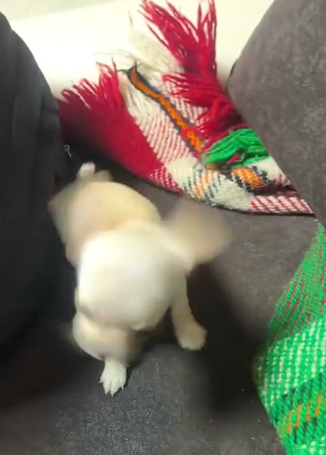 - "A small tan Chihuahua puppy interacts with a person and several colorful woven blankets or pillows on a dark brown upholstered surface, likely a couch or sofa" by FM-BjNp73, licensed under CC BY 4.0