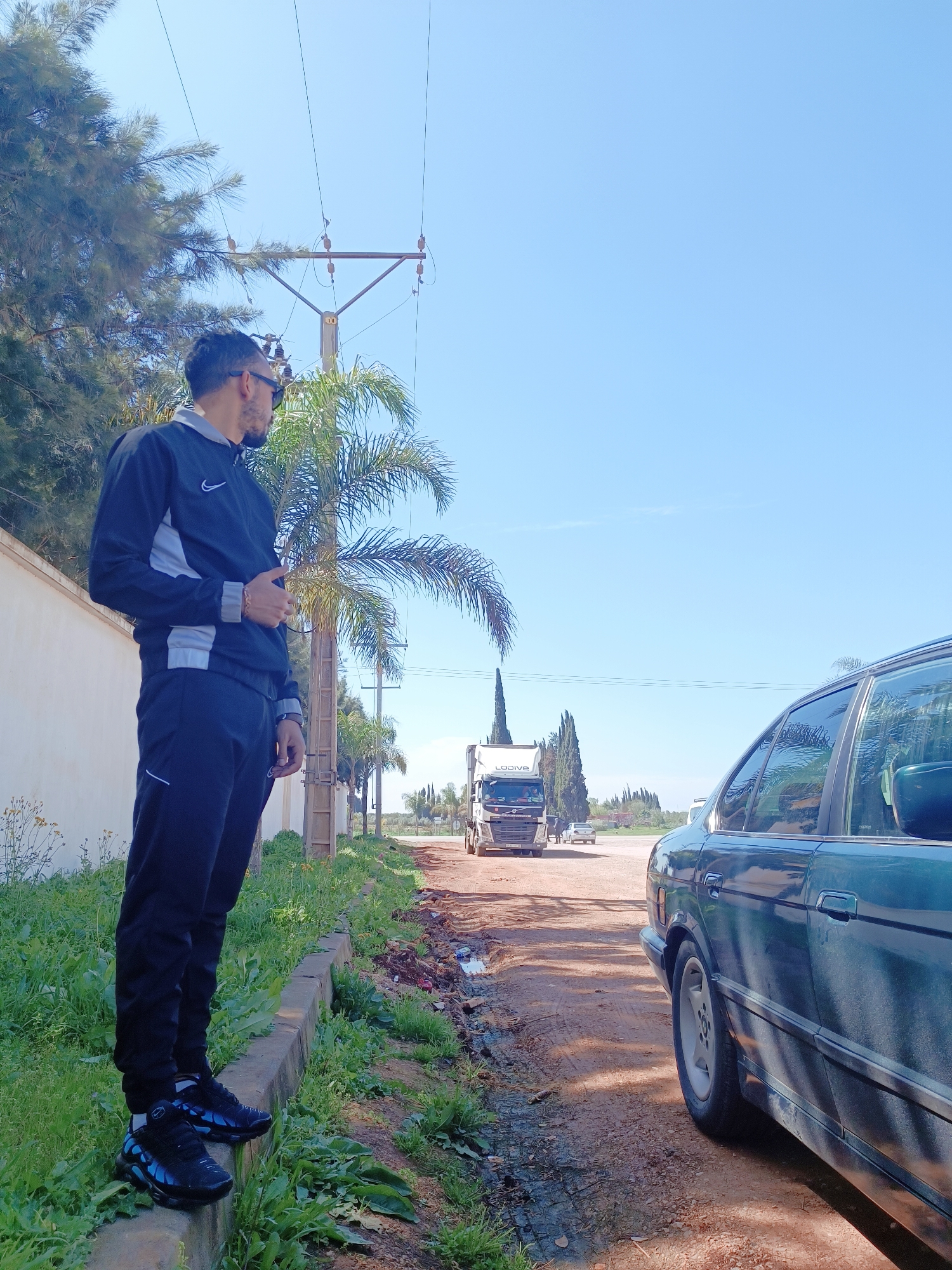 A male individual stands on a concrete curb at the edge of an unpaved, reddish-brown dirt road under a clear blue sky. He wears a dark blue Nike tracksuit with grey accents, black Nike Air Max Plus TN sneakers, and dark sunglasses. His right hand is slightly raised. He faces right, looking towards the distant road. To his right, a dark green sedan, likely a BMW E34, is parked partially on the dirt road, with its rear passenger side visible. Further down the road, a white Volvo semi-truck with "LODIVE" visible on its trailer, followed by a smaller white car, travels away from the viewer. The left side of the scene features a white concrete wall, green grass with sparse yellow flowers, and pine-like trees. A wooden utility pole with power lines stands behind the man. Palm trees and tall, conical evergreen trees are visible along the road leading to the horizon. The location is Unknown, Unknown.