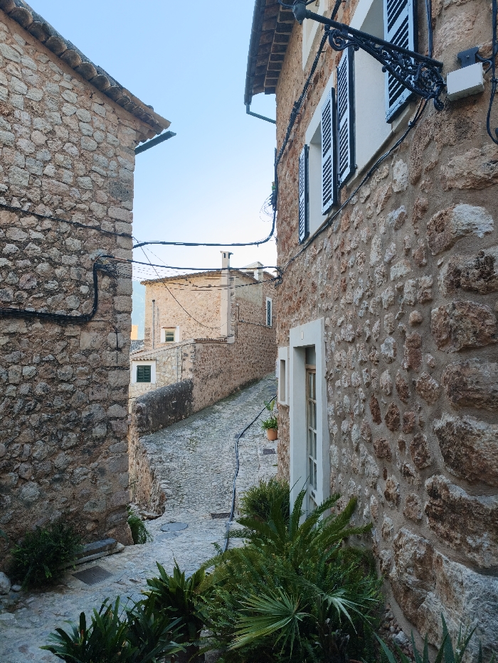 The image depicts a narrow, sloping cobblestone street in Fornalutx, Spain, flanked by ancient stone buildings under a clear blue sky