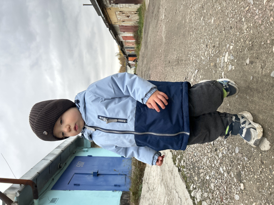 - "A toddler, wearing a dark brown knit beanie, a light blue and navy blue color-blocked winter jacket, dark grey pants, and grey and navy athletic shoes with light green accents, is depicted walking on an unpaved gravel and dirt path" by FM-kJsX23, licensed under CC BY 4.0