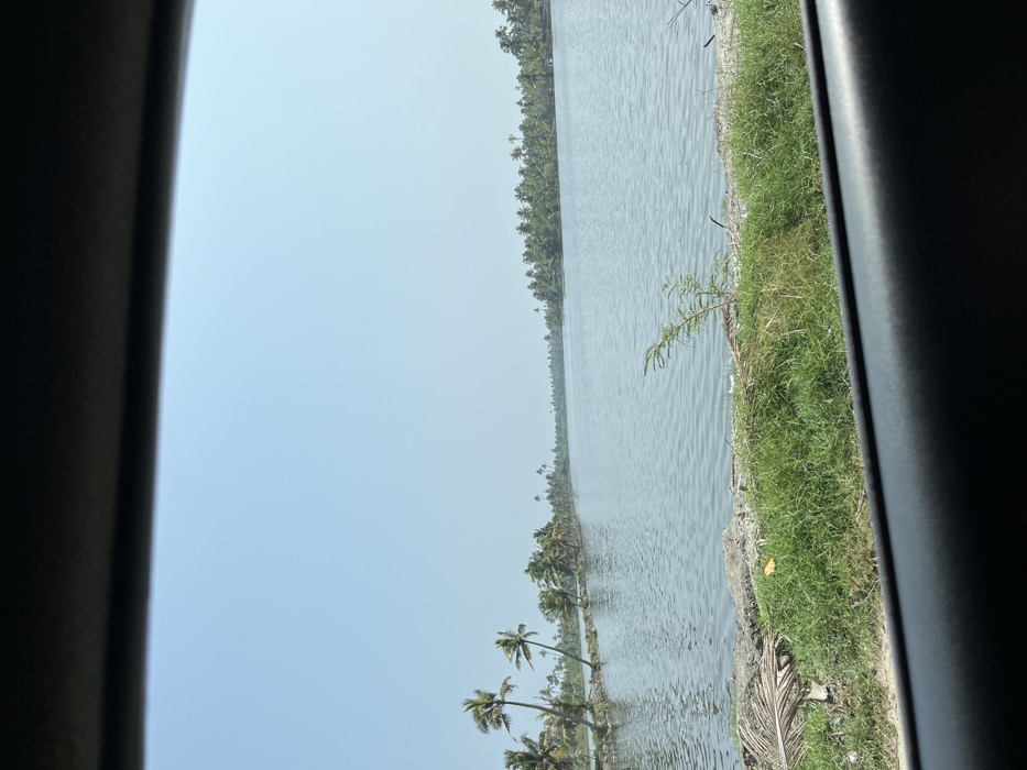 The image presents a wide outdoor view, likely from within a vehicle, of a calm body of water flanked by land dense with palm trees under a clear sky in Andhakaranazhy, India