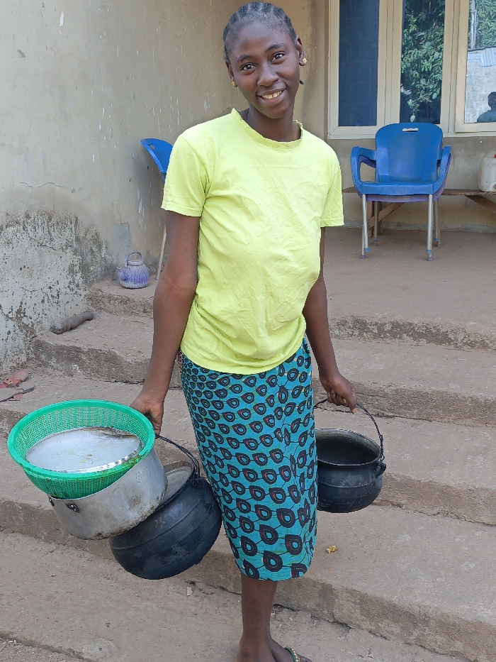 An outdoor scene in Akwanga, Nigeria, depicts a young woman standing on a concrete surface with visible steps. She has dark skin, braided hair, and is wearing a light green short-sleeved t-shirt and a teal skirt patterned with black and red circular motifs. She is smiling towards the viewer. In her left hand, she carries a stack of cooking vessels, including a black cast-iron pot, an aluminum pot, and a green plastic colander containing a metal bowl/lid. In her right hand, she carries a single black cast-iron pot by its wire handle. The background features a light-colored concrete building wall. To the left, a blue plastic chair is partially visible, along with a purple kettle and a dark, elongated object on the ground. To the right, a window with blue frames reflects foliage, and another blue plastic chair is situated further back near a white container on a low surface.
