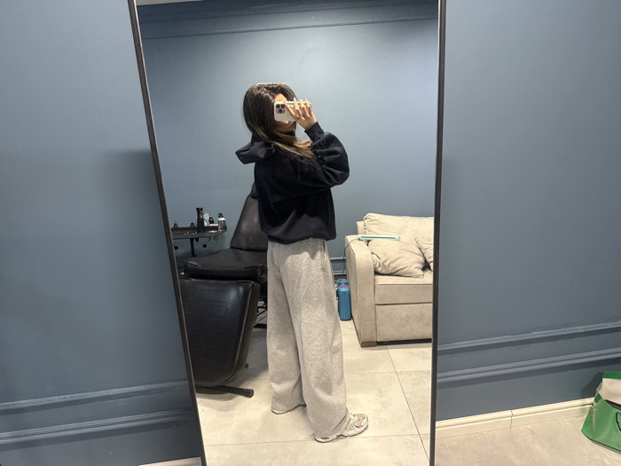 The image depicts an indoor scene within a commercial establishment in Yerevan, Armenia. A person with long dark hair is reflected in a tall, rectangular mirror, standing sideways to the viewer. This individual wears a black hooded sweatshirt, light grey wide-leg sweatpants, and white-soled sneakers. They are actively holding a light-colored smartphone at eye level, obscuring their face with the device, to capture their own reflection. Visible on the hand holding the phone are long, light-colored fingernails. The room features muted blue/teal walls with a distinct baseboard and crown molding. The floor is covered with light-toned tiles. To the viewer's left within the reflection, a black, adjustable reclining chair, consistent with those used in tattoo or aesthetic services, is positioned. Behind this chair, a multi-tiered utility cart holds several bottles and small containers. To the viewer's right within the reflection, a beige fabric armchair with a light-colored pillow provides additional seating. A vertical blue object is partially visible behind the armchair. A green and white shopping bag is on the tiled floor in the far right foreground. The environment suggests an aesthetic or tattoo studio.