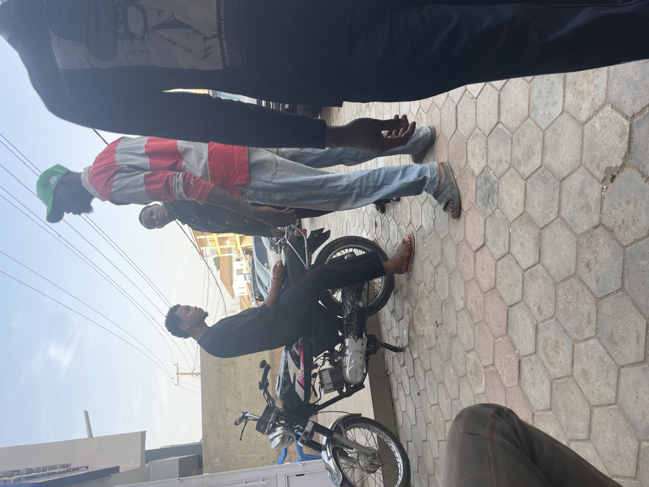A person sits on a motorbike in a street setting. The motorbike faces the viewer, and the person is wearing dark clothing. Several other individuals are visible, standing nearby and looking at the motorbike. A man with a green cap is also seen in the frame. The surrounding area appears to be an outdoor urban environment with buildings in the background and hexagonal brick patterns in the foreground.