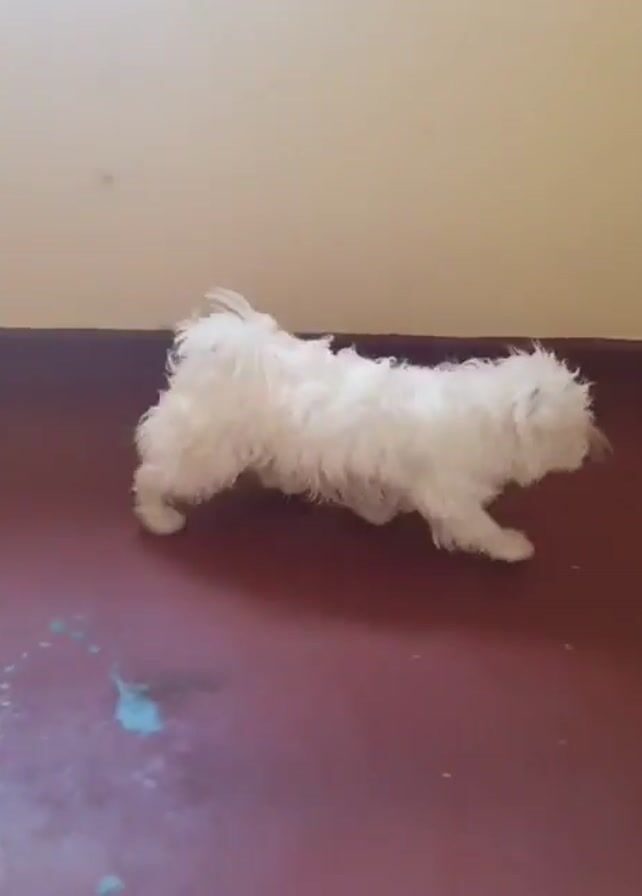 Two small, white, furry dogs stand on a reddish-brown painted floor near an intersection of two off-white walls. One dog stands mostly still while the other walks slowly around it.