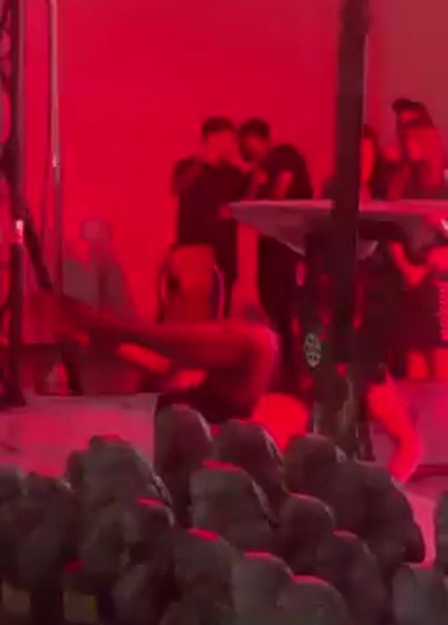 row of trophies in the foreground with an indistinct group of people and equipment in the background. The trophies appear to be bust sculptures of people's heads. In the background, several people are standing and appear to be operating equipment that includes a keyboard and an electrical instrument. A performer wearing shorts and black stockings is doing a handstand in front of the trophies. The scene is lit in red light.