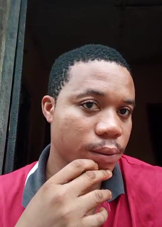 A man in a red shirt with a gray collar is looking at the camera, touching his chin with his hand. The background is out of focus and shows what seems to be a window frame and the edge of a wall. The lighting is natural but slightly dim. The man has short, dark hair and some facial hair, and he has some skin blemishes. He appears to be standing indoors.