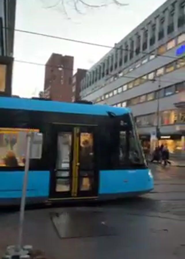 A blue tram is driving past a street in a city. People are walking on the sidewalk. A large building with the words "Hoyres Hus" on it is in the background. The sky is overcast.