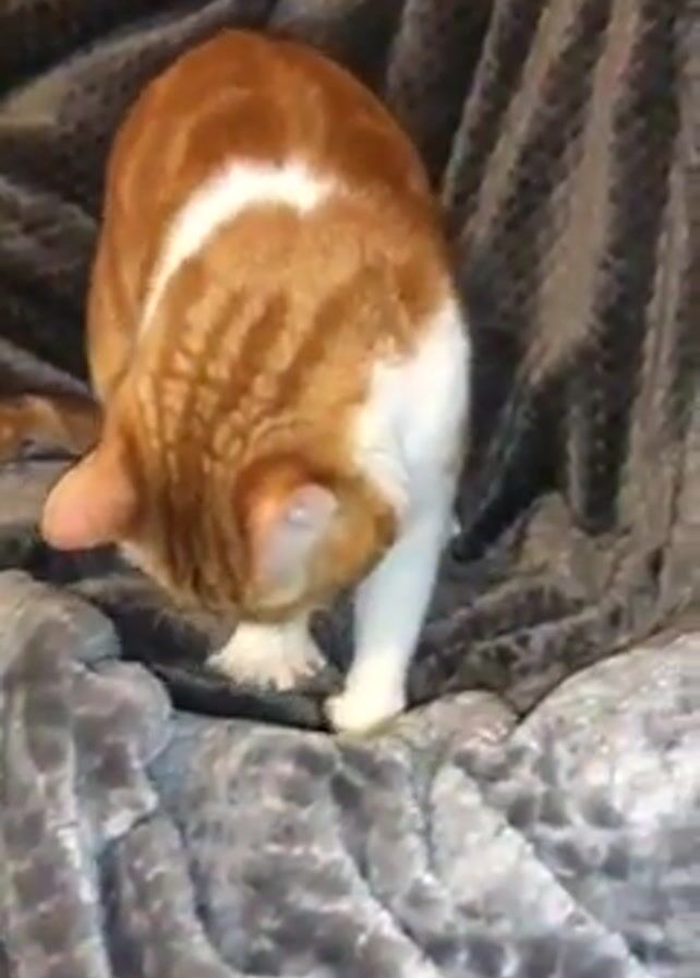 An orange and white cat stands on a gray blanket with a textured pattern. The cat is facing away from the camera, its head lowered as it appears to be grooming its front leg. The background is a plain white wall.