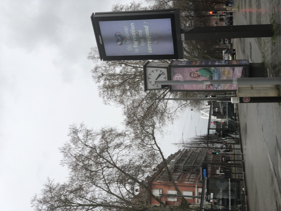 A street scene on an overcast day features a modern digital advertising kiosk displaying the phrase "Où trouver la formation qui me correspond?"