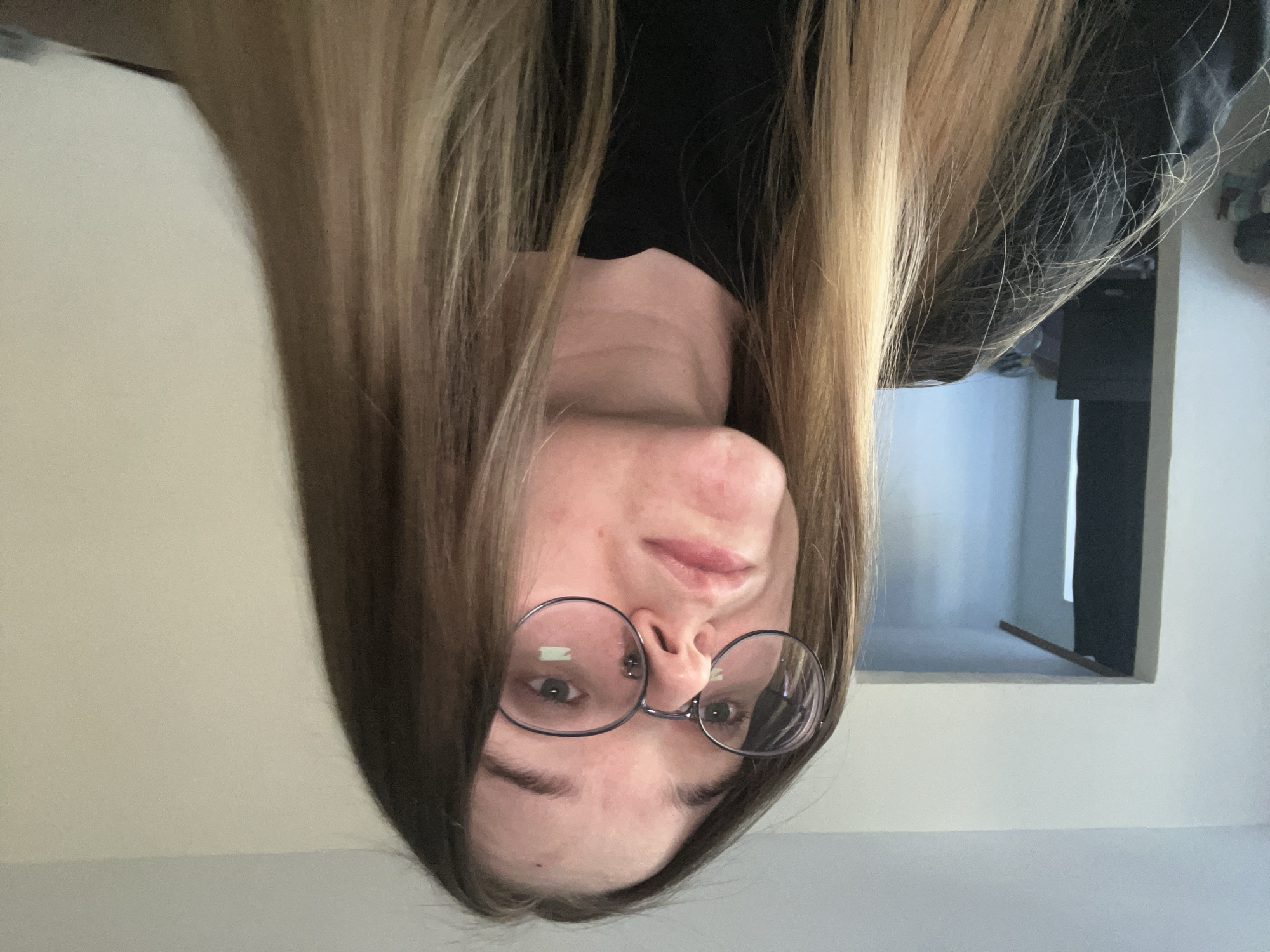 The image depicts a young adult female in a frontal view, positioned indoors. She has long, straight hair, dark brown at the roots and fading to a lighter blonde-brown towards the ends, framing her face. She wears round, dark-rimmed glasses, with reflections visible on the lenses. Her eyes are light in color, and her lips are closed with a subtle upward curve. The woman's skin exhibits some minor redness on the cheeks and forehead. She is wearing a black, possibly crew-neck, top. Her head is slightly tilted upwards and to her left, and she is looking directly at the camera. The background consists of light-colored, possibly off-white or pale beige, walls. To the left and slightly behind her, a doorway with a dark frame leads into another room, which appears dimly lit. Within this background room, indistinct dark shapes, possibly furniture or electronics like a television or monitor, are partially visible. No specific city landmarks or geographical features are present to confirm the location within Pushchino, Russia, beyond the general indoor setting. The lighting is soft and even, suggesting an interior light source. No interactions between individuals are depicted.