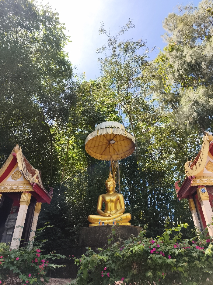 A golden Buddha statue sits atop a stone platform, shaded by an ornate, golden umbrella. Lush green foliage and scattered pink flowers surround the base. Two small, ornate buildings with red and gold roofs flank the statue. The background is filled with dense trees, partially obscuring a bright blue sky. The sunlight peeks through the leaves, creating a scene of tranquility.