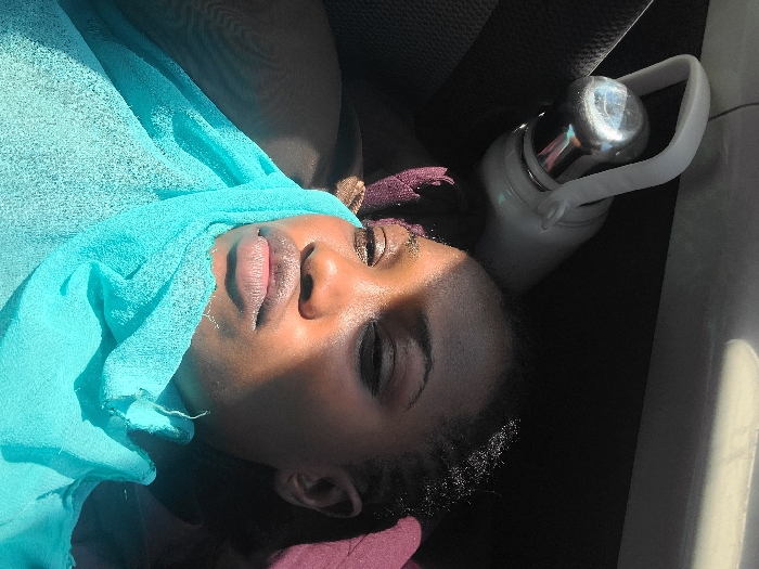An individual is depicted within a vehicle in Kujama, Nigeria. The subject is a young adult female with dark skin, her head tilted slightly, with dark, braided hair visible on her forehead. She is wearing a light blue/turquoise sheer fabric draped around her neck and chest area. A portion of a dark, possibly purple or maroon, fabric is visible near her left shoulder. Her eyes are partially closed or cast downwards, and her expression appears subdued. Strong direct sunlight illuminates the left side of her face, creating prominent highlights on her forehead, nose, and lips, while casting shadows on the right side. In the upper left background, a white bottle with a silver reflective cap and a white carrying handle is visible, positioned against a dark vehicle interior panel, possibly in a seat pocket or console. The background consists primarily of dark vehicle interior elements, indicative of a confined space. No direct actions or interactions with other individuals are visible.