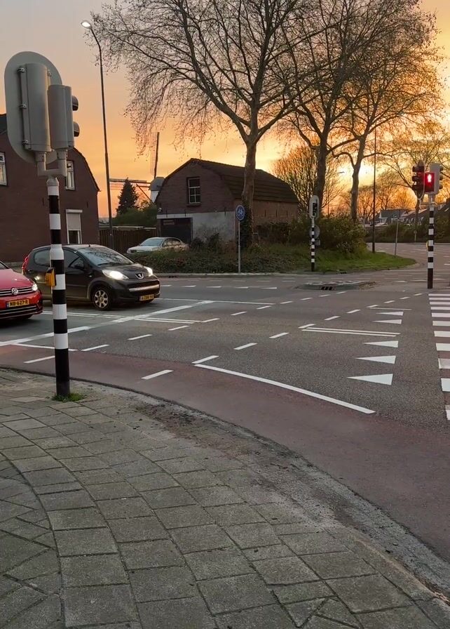 street intersection in the Netherlands at sunset. A black Peugeot and a red Volkswagen are visible passing through the intersection. The sky is orange and yellow, and bare trees frame the background. A windmill can be seen in the distance. The traffic light is red. The foreground features a grey stone sidewalk.