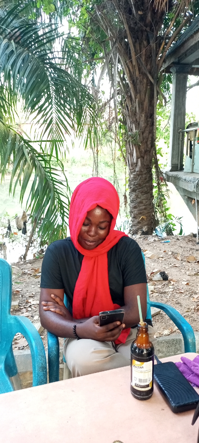 A dark-complexioned individual, identified as female, is seated outdoors in Adankolo, Nigeria. She wears a black short-sleeved top, light-colored trousers, and a bright red headscarf. Her left wrist displays a black beaded bracelet. She is looking down at a black smartphone held in both hands, displaying a slight smile. She sits in a light blue plastic armless chair. In front of her, on a light brown table, rests a brown glass bottle of "MALTINA" with a light green straw, a black rectangular object resembling a power bank, and a piece of crumpled purple fabric. The immediate ground consists of dry earth with scattered leaves and debris. The background features dense green foliage, including large palm fronds on the left and a prominent, textured tree trunk on the right. A body of water is partially visible through the vegetation in the mid-background. On the far right, a concrete structure with a section of a corrugated metal roof is visible. The scene is illuminated by natural daylight.