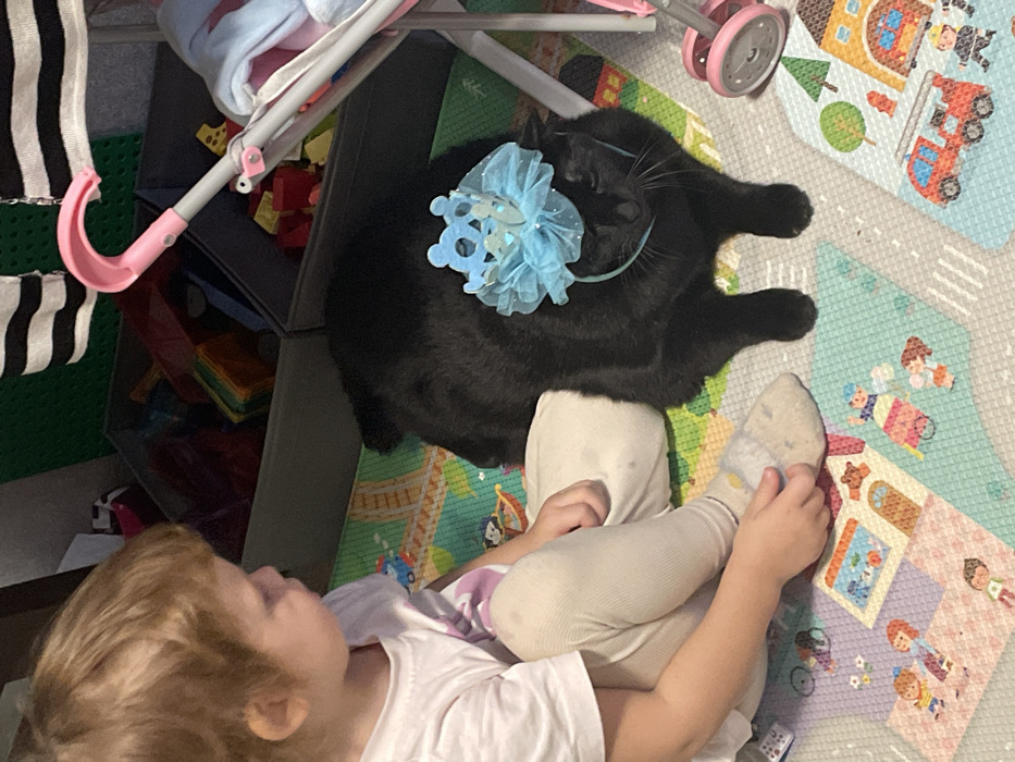 - "The image captures an indoor scene depicting a young child and a black cat interacting on a playmat" by FM-hENj12, licensed under CC BY 4.0