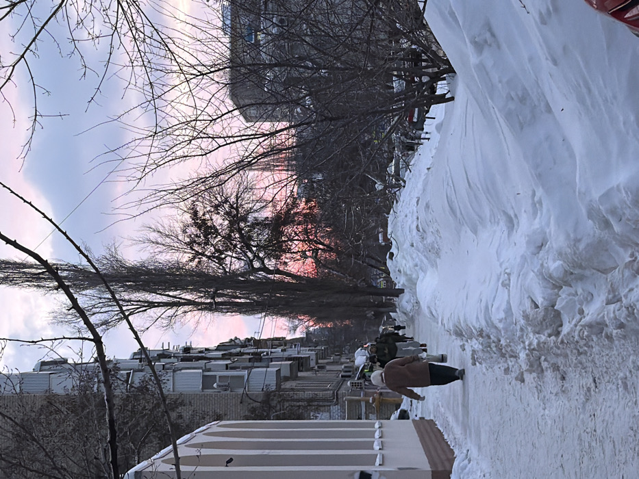 A street scene in winter with high snowbanks along the edge. Bare trees line the street, with buildings visible behind them. A group of people walk on the narrow pathway cleared through the snow. The sky shows a mix of pink and grey, suggesting either dawn or dusk. A tall, modern building looms in the background behind the trees. The image is rotated 90 degrees clockwise.