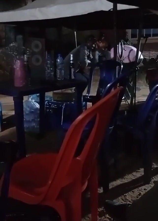 group of people socializing outdoors at night under a white canopy. Several blue plastic chairs surround a table filled with water bottles and other items. There is one red plastic chair in the foreground. Some individuals are seated at the table, while others are standing and moving around. A speaker is visible on the table, and music is playing. The overall atmosphere appears to be casual and lively.