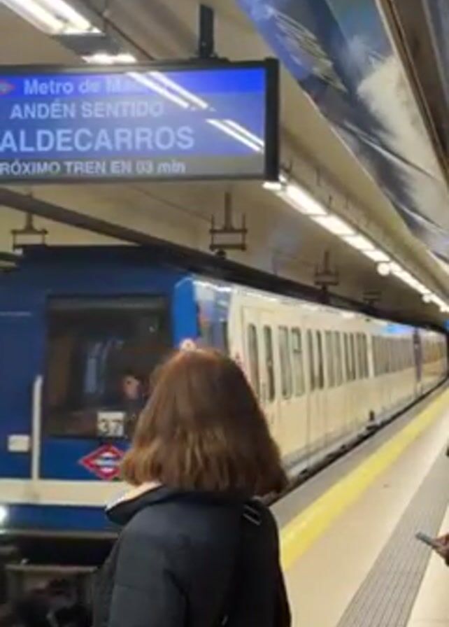 A subway train pulls into a station. A woman with reddish-brown hair is standing on the platform, facing the train. She is wearing a black jacket and a black crossbody bag. Above her is a digital sign that reads "Metro de Madrid" and information about the direction of the train and when the next train is due. The train is white with blue accents. The station is brightly lit with fluorescent lights. Another person is visible in the background, sitting on a bench. The overall impression is a typical scene at a busy subway station.