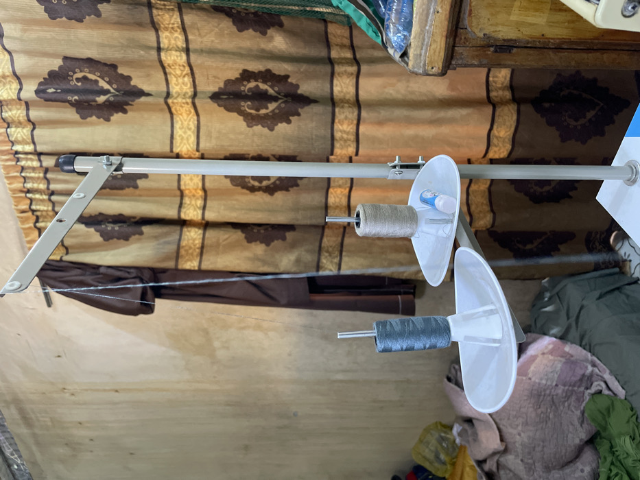 - "This image depicts a two-spool thread stand for an industrial sewing machine, situated indoors in Kaura Goje, Nigeria" by FM-CRYJe2, licensed under CC BY 4.0