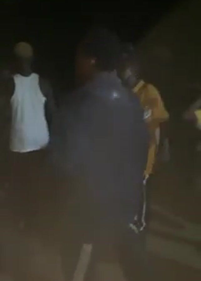 The video, recorded at night, shows a group of people gathered outdoors, likely socializing. The scene is dimly lit, making details difficult to discern. Several people are visible, including one wearing a white tank top, another in a yellow shirt with writing on it, and someone in a blue shirt. There is another person wearing what looks like a pink head covering. A person in a dark jacket and pants walks around within the group. The ground appears to be dirt or gravel. Movement suggests some kind of activity or dance, but it's not clear due to the darkness. The sound is a rhythmic song.