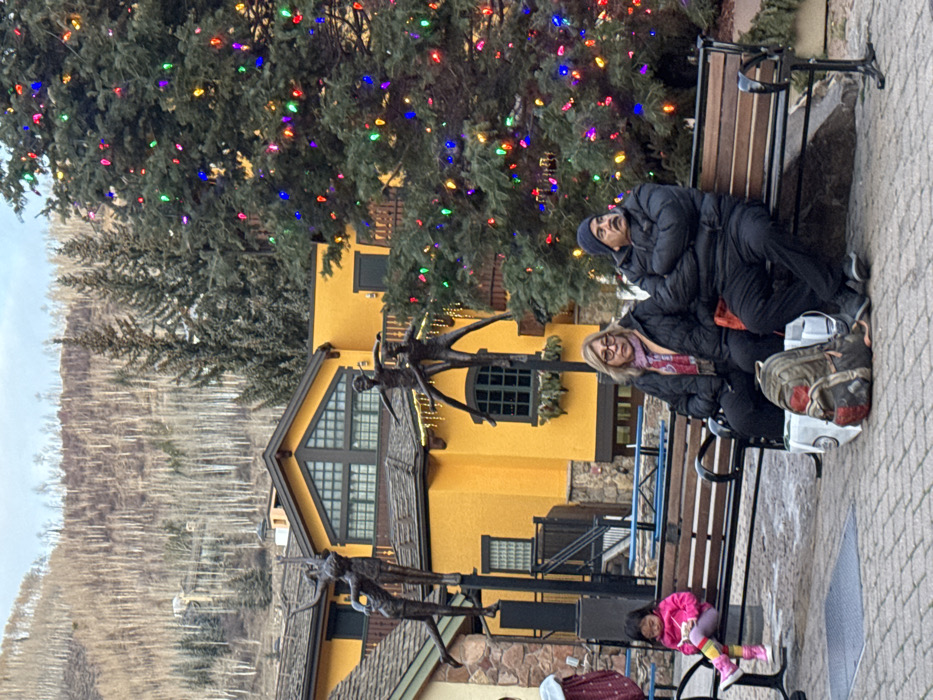 Two adults sit on a park bench near a building painted yellow. A child wearing a pink jacket and striped tights is sitting on a bench nearby. A large tree with colorful lights decorates the scene. Bronze statues of figures in motion are placed in front of the building. A mountain range with leafless trees is visible in the background under a gray sky.