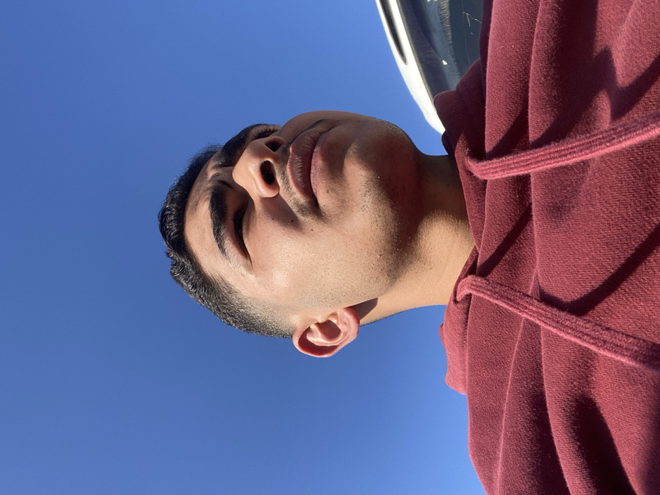 An upward-angle photo features a person against a clear blue sky. The person, wearing a maroon hoodie with visible drawstrings, looks upward, eyes closed. Their face is brightly lit, highlighting smooth skin and a close-cropped hairstyle. The composition is framed by the blue sky, which occupies most of the space. A partial white object, possibly a vehicle, is visible at the top edge of the frame.
