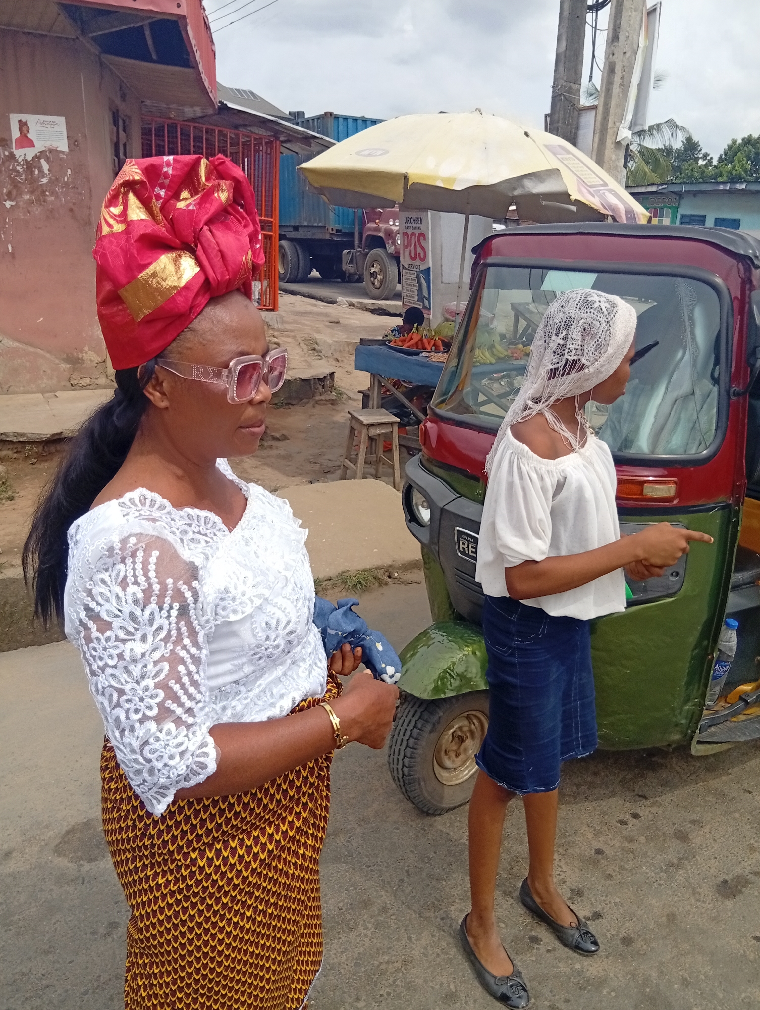 A medium outdoor shot depicts two women in a street setting in Aba, Nigeria, next to a green and maroon "Keke" auto rickshaw. The woman on the left, presumably older, wears a red and gold head wrap, a white lace top, a brown and yellow patterned skirt, and pink sunglasses. She is holding a blue cloth in her left hand and wears a gold bracelet on her right wrist. The woman to her right is younger and wears a white off-the-shoulder blouse, a short denim skirt, a white lace head covering, and black flats. She points her right index finger away from the camera, toward an unseen subject. An "Aquafina" water bottle is nestled behind the rickshaw. Behind the women and the rickshaw is a vendor's stand with an open yellow umbrella, where carrots and bananas are displayed. Further back is a red truck, a building with a rusty metal gate, and a weathered building with a faded poster. The sky is overcast. An electrical pole stands on the right side of the image.