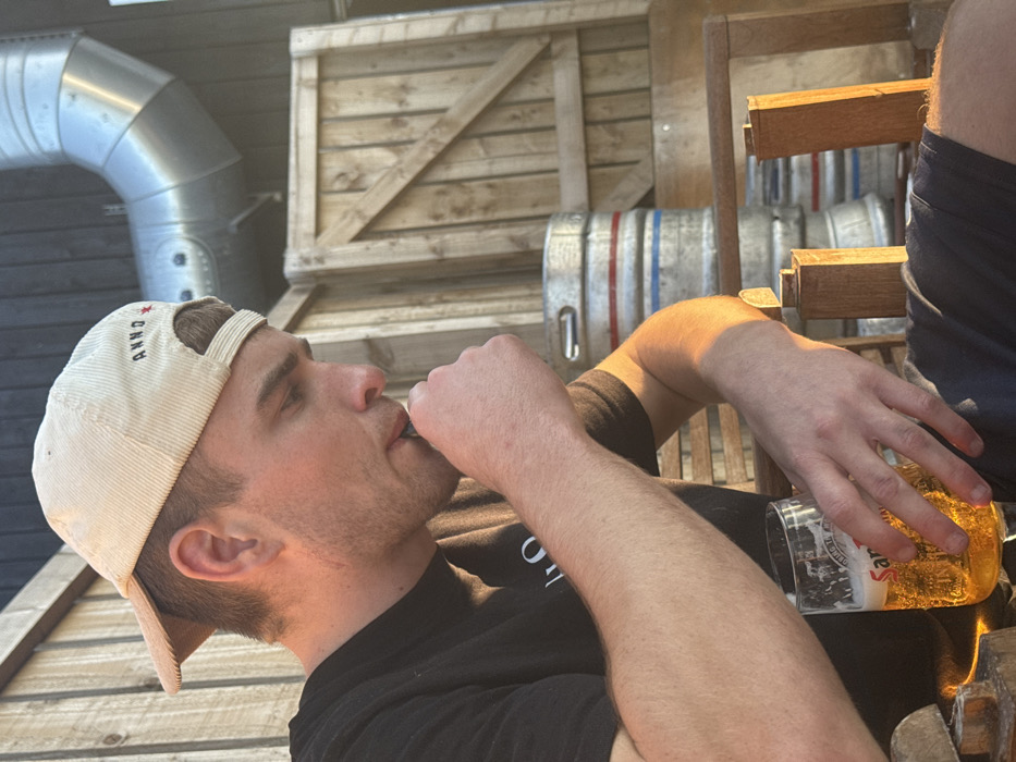 The image depicts a male individual, appearing to be in his twenties or thirties, seated in an outdoor setting at The Annos Arms, located at 15 Friarage St, Northallerton, DL6 1DP, United Kingdom. He is wearing a black t-shirt, dark shorts, and a light beige corduroy baseball cap with the brim backward, displaying "ANNO" and a red star embroidered on the rear. The subject is illuminated by direct sunlight on his right side. His left hand holds a transparent glass containing a golden, bubbly liquid, identified by "San Mig" branding, consistent with San Miguel beer. His right hand is raised towards his mouth, holding a small, dark cylindrical object, from which he appears to be inhaling. He is looking downwards and to the right of the frame. The background consists of vertical wooden slatted panels or fencing. To the right, a large, curved, metallic ventilation duct is visible, along with a wooden gate or panel. Multiple silver-colored beer kegs, some marked with red and blue bands, are stacked in the background, further indicating a pub or brewery environment. The seating is part of a wooden outdoor chair. The overall scene suggests a casual, outdoor pub garden setting under strong, natural, warm light.